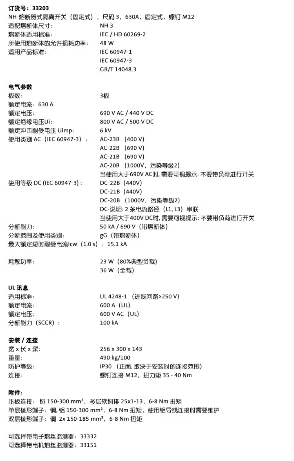 Wohner NH FUSE SWITCH-DISCON. SIZE 3, 630 A, PANEL MOUNTING (33203)